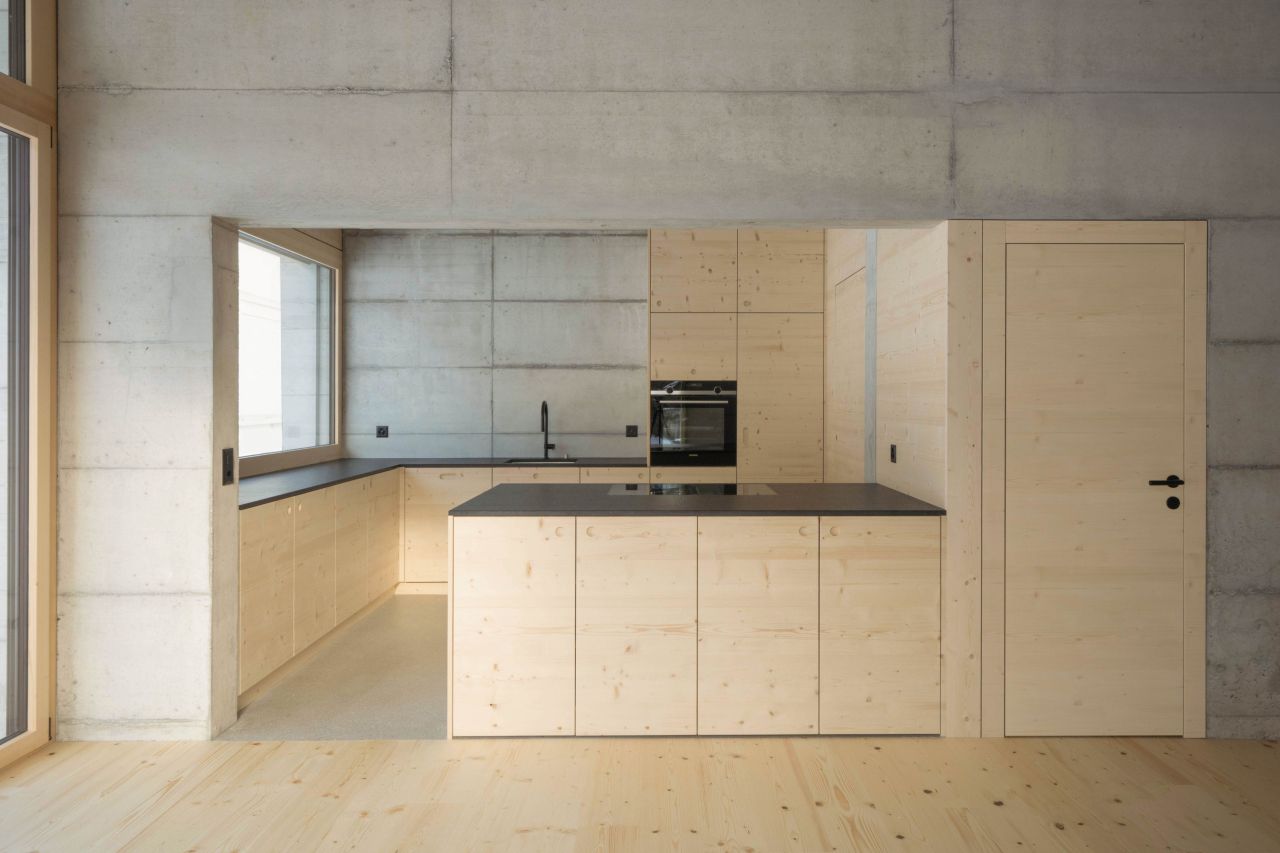 Ce projet familial contenant un appartement de 4.5 pièces et un autre de 3.5 pièces est situé en zone ISOS. Il s'inspire de son contexte en reprenant plusieurs règles dictées par les bâtiments voisins : le faîte, orienté parallèlement à la route, marque une continuité avec le quartier, les façades gouttereaux sont en bois alors que les façades pignons, décalées pour casser la longueur, se parent d'un revêtement minéral.